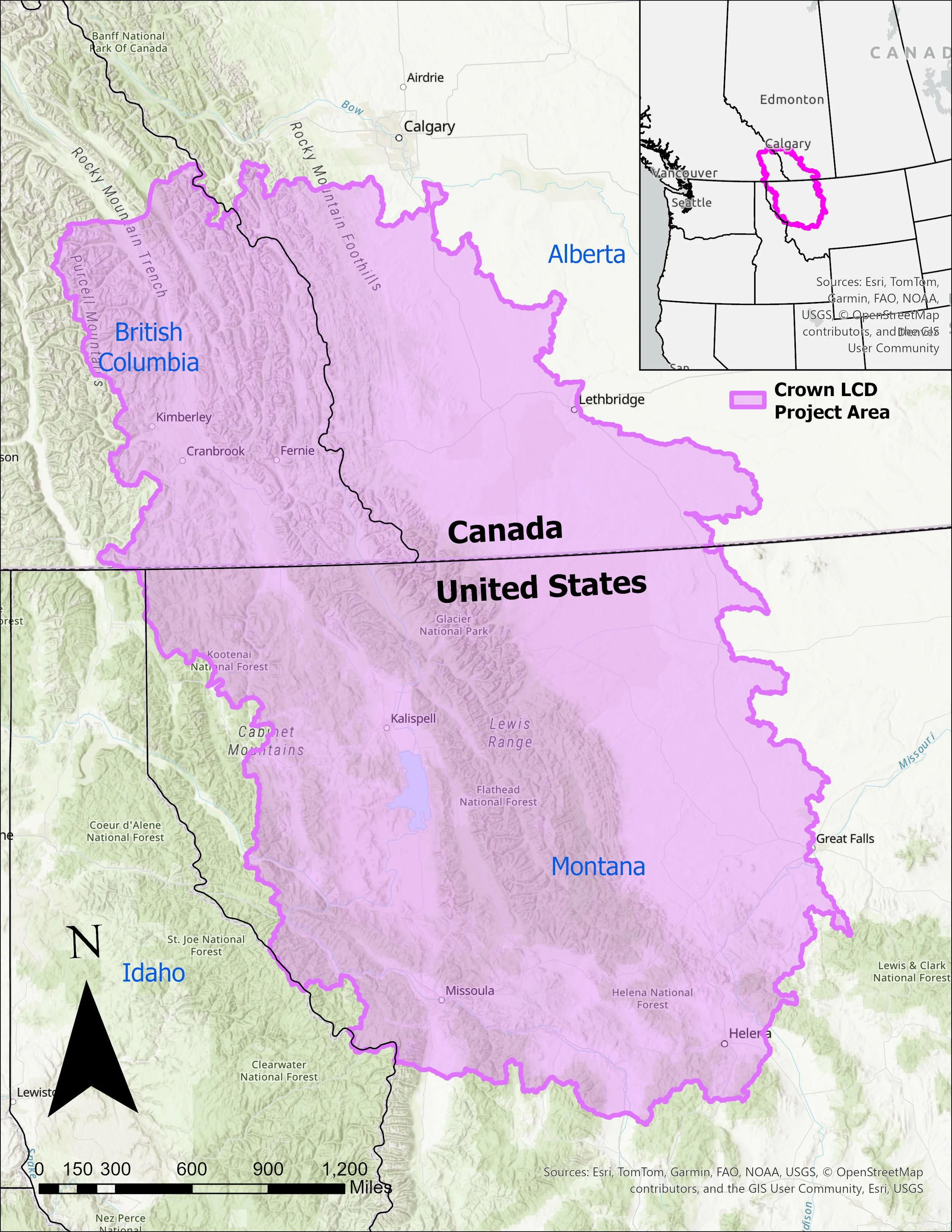Figure 1. From mountain peaks to prairie, the Crown of the Continent LCD spans 131,508 sq km (50,775 sq mi) and straddles the United States and Canada in Alberta, British Columbia, and Montana.
